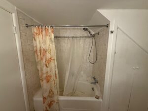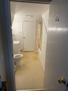 The original bathroom showed its age with worn flooring, outdated fixtures, and limited functionality. The tub/shower combo felt enclosed and lacked both style and efficiency, while the overall layout didn’t make the best use of the available space. Lighting and finishes left the room feeling dim and tired.