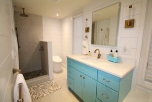 The walk-in shower was designed with simplicity and function in mind, incorporating sleek tilework and an open layout to maximize space. Bright finishes and updated lighting help the room feel larger and more welcoming.