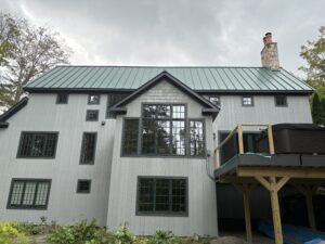 The green standing seam metal roof plays a key role in tying everything together. Its rich tone complements the natural surroundings while adding durability and long-term performance—an ideal combination for a home in this setting.